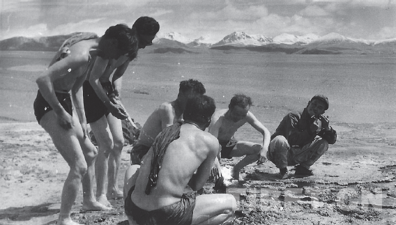 阿里分隊(duì)1976年8月在日土縣帕也布也雪山下的帕也曲真溫泉邊洗澡。站立者左為黃復(fù)生,右為孫鴻烈;蹲坐者右起:章銘陶、謝自楚、武素功等 王富葆/攝影