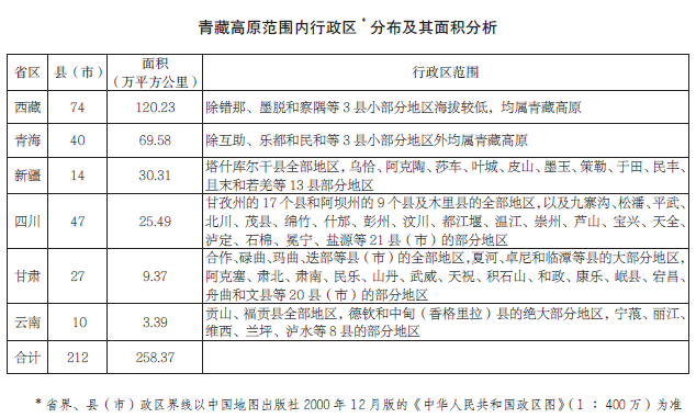 在行政區(qū)劃上,青藏高原范圍涉及6個(gè)省區(qū)、212個(gè)縣(市),即西藏自治區(qū)(錯(cuò)那、墨脫和察隅等3縣僅包括少部分地區(qū))和青海?。ú糠挚h僅含局部地區(qū)),云南省西北部迪慶藏族自治州,四川省西部甘孜藏族自治州和阿壩藏族羌族自治州、木里藏族自治縣,甘肅省的甘南藏族自治州、天祝藏族自治縣、肅南裕固族自治縣、肅北蒙古族自治縣、阿克塞哈薩克族自治縣以及新疆維吾爾自治區(qū)南緣巴音郭楞蒙古自治州、和田地區(qū)、喀什地區(qū)以及克孜勒蘇柯爾克孜自治州等的部分地區(qū)。