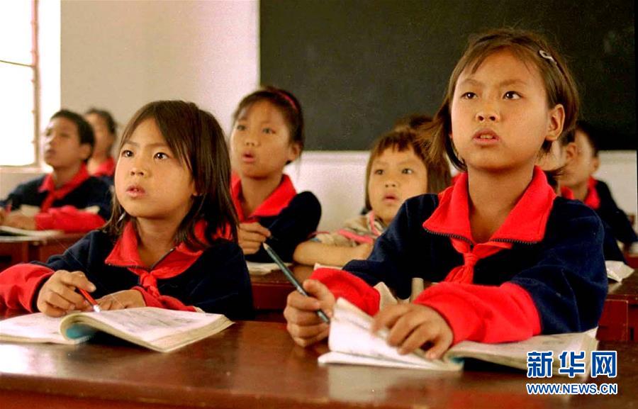 苦聰姐妹張民勒(前右,時(shí)年10歲)和張民松(前左,時(shí)年8歲)和同學(xué)們在云南省者米鄉(xiāng)下納咪小學(xué)內(nèi)上課(資料照片)。新華社記者 藺以光 攝