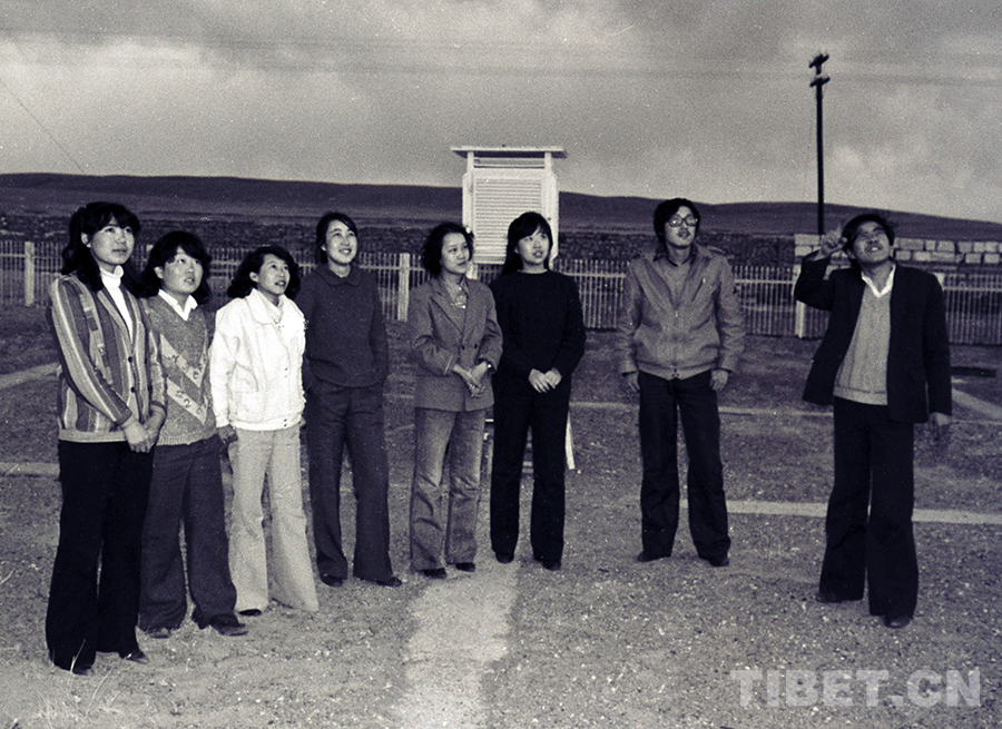 五道梁氣象站副站長尹憲志(右一),在向同事介紹當(dāng)?shù)貧庀笄闆r(唐召明1987年攝)