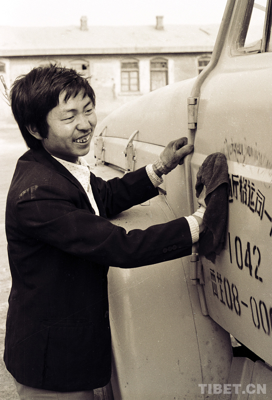 西藏交通廳格爾木汽車運(yùn)輸公司一隊(duì)汽車駕駛員楊忠禮在擦拭汽車。(唐召明1987年攝)
