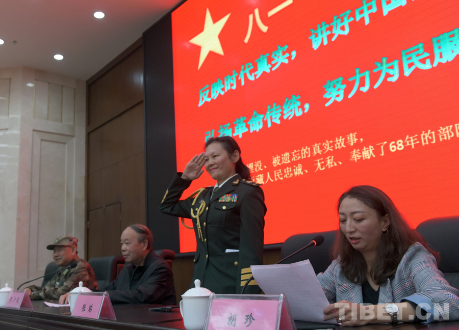 圖為張琪向聽眾致軍禮。當日,“老西藏精神和兩路精神進校園”宣講報告會在拉薩舉行(唐召明2018年9月18日攝)