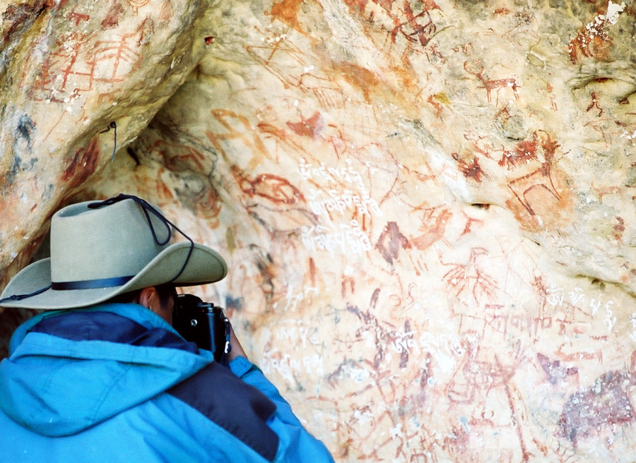 圖為科考人員在對(duì)納木錯(cuò)扎西半島洞穴巖畫進(jìn)行考察拍照(唐召明2001年攝)
