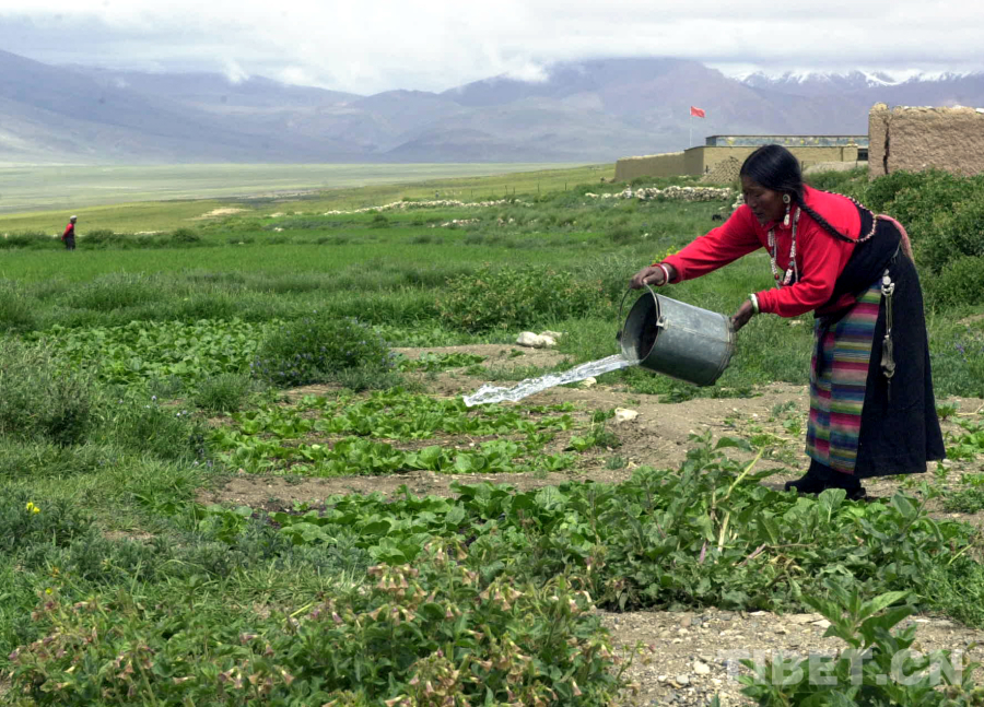 這是在尼瑪縣文部鄉(xiāng)南村的當(dāng)惹雍錯(cuò)湖畔,一位藏族婦女在為蔬菜澆水(唐召明2001年攝)