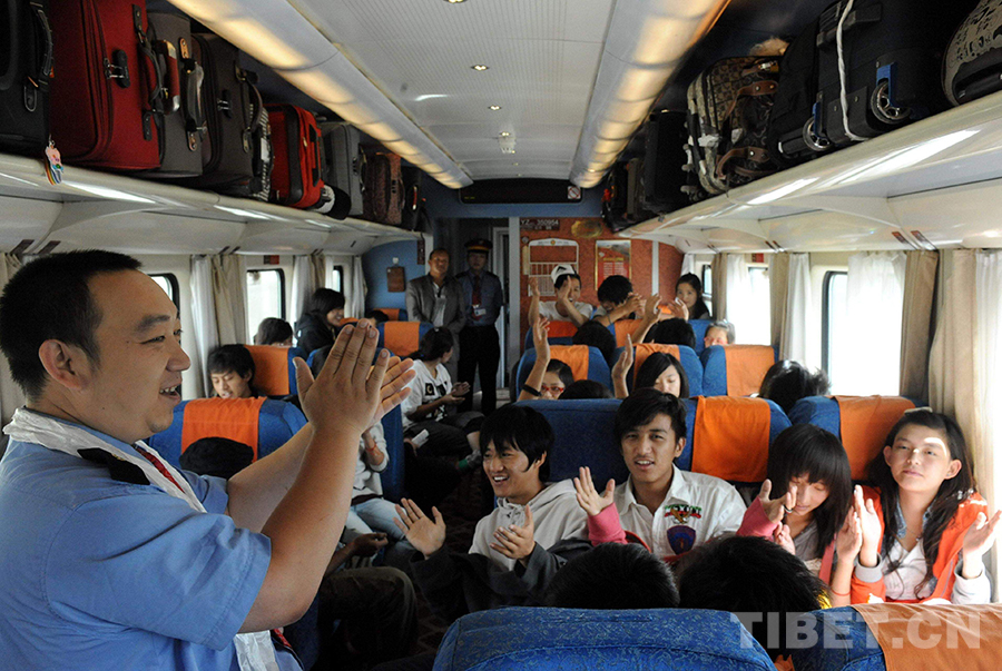 這是被稱為“快樂大叔”的共產(chǎn)黨員、京藏列車三組列車員鄭志剛(左一),在北京開往拉薩的列車上,與乘車藏族學(xué)生一起歡歌(唐召明2010年7月4日攝)