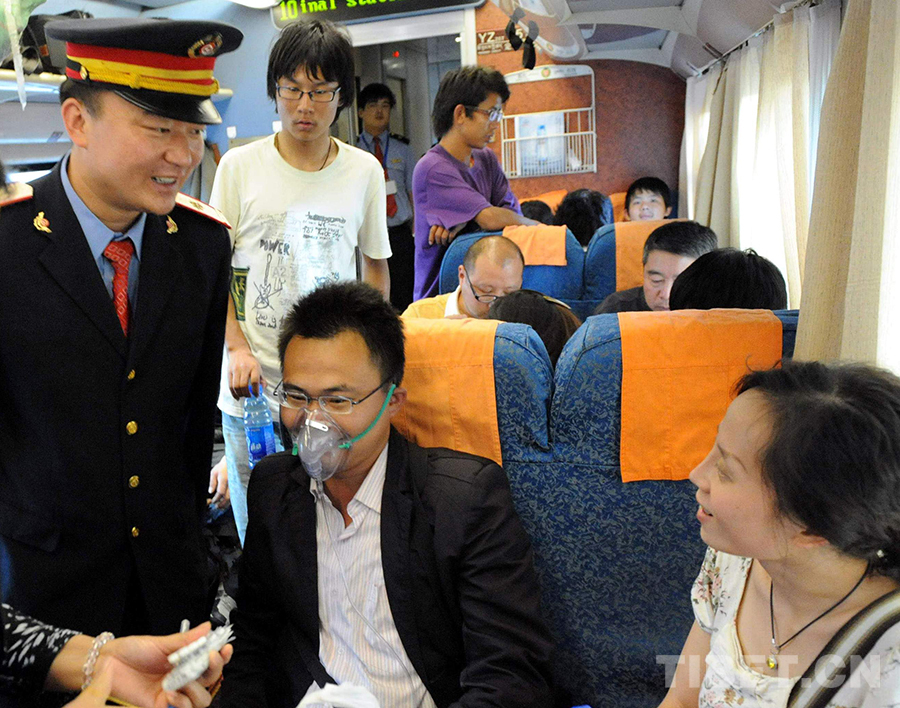 這是夫妻同在京藏列車上工作、被人們親切稱為“高飛的比翼鳥”的京藏列車十一組列車長王寶山(左一)為身體不適的旅客送上氧氣面罩,幫助其吸氧(唐召明2010年8月22日攝)