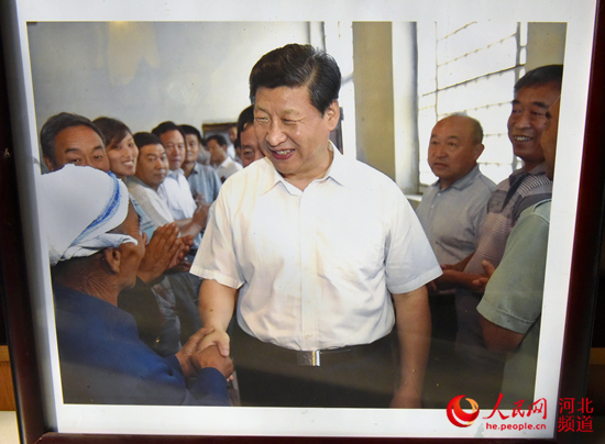 圖為2013年習(xí)近平總書記在平山縣西柏坡革命舊址同閆青海握手交談。(翻拍于閆青海家相框中照片。付兆颯 拍攝)