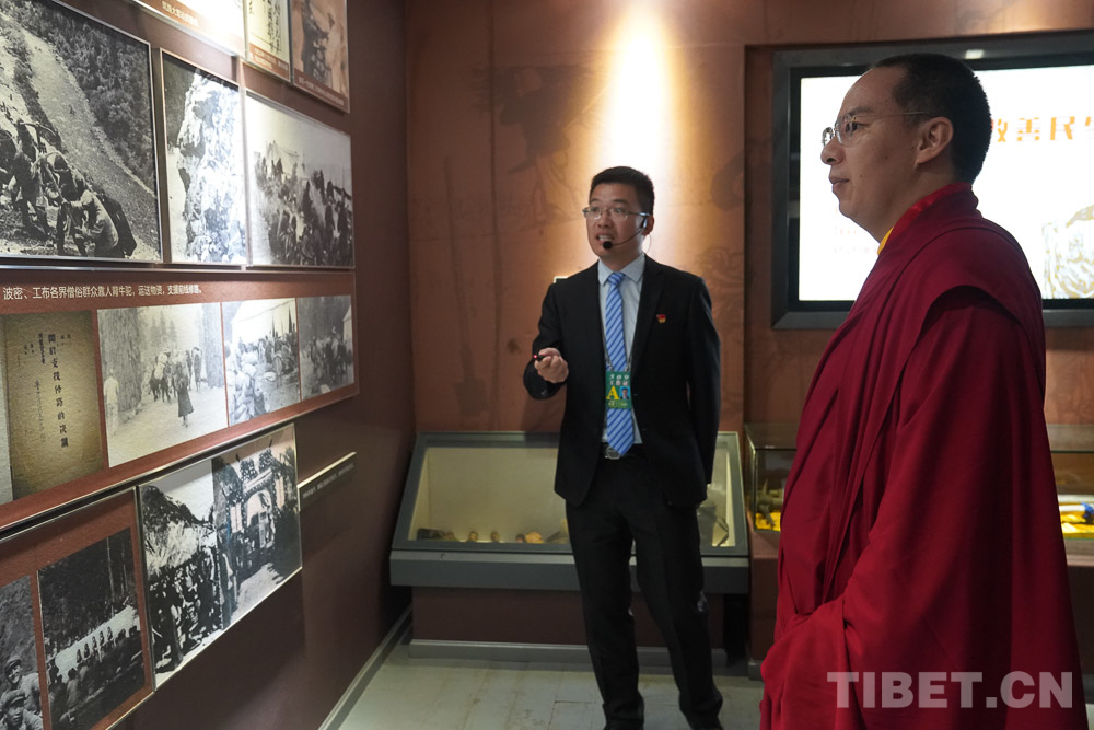 十一世班禪一路緩步前行,時而抬頭仰望、時而俯身凝視。在講解員的介紹下,從和平解放、民主改革,到社會主義建設、改革開放,再到新時代,依次參觀了各展區(qū)。