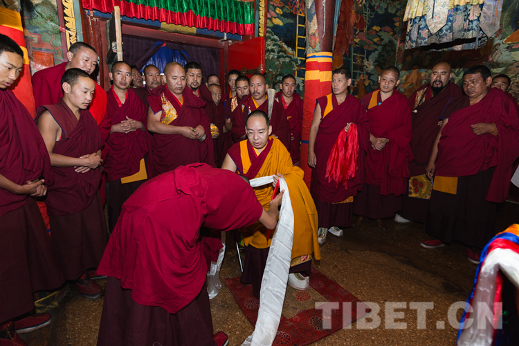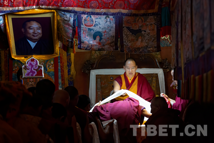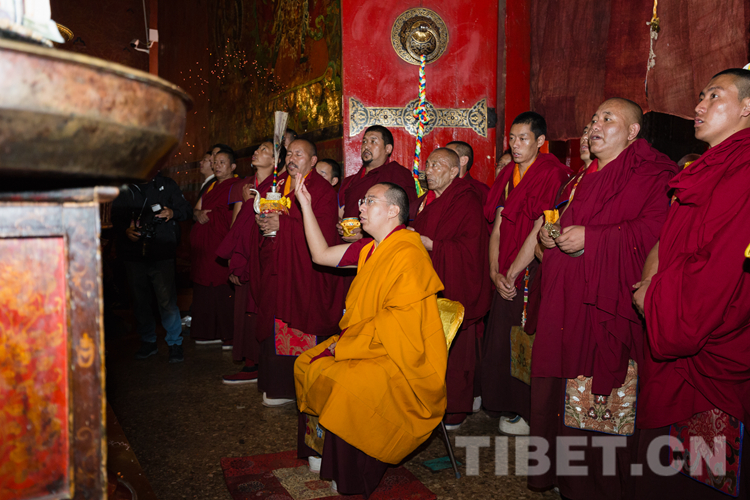 下午,在拉讓日光殿內(nèi),十一世班禪登上寶座接受扎什倫布寺僧眾的朝拜,為他們摸頂賜福,并帶領僧眾誦經(jīng)祈禱,渾厚的誦經(jīng)聲響徹殿內(nèi)。