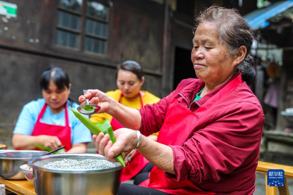 5月25日,村民在貴州省岑鞏縣思旸鎮(zhèn)龍江村包粽子。新華社發(fā)(胡攀學(xué) 攝)