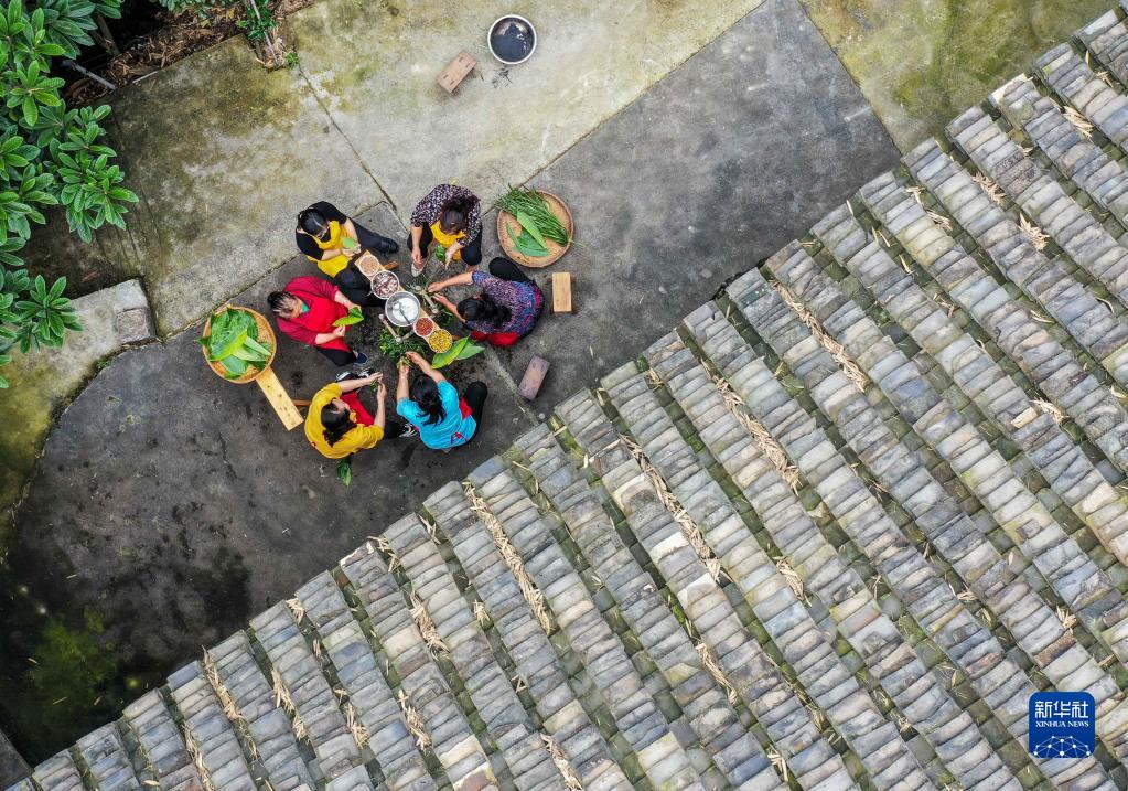 5月25日,村民在貴州省岑鞏縣思旸鎮(zhèn)龍江村包粽子(無人機照片)。新華社發(fā)(胡攀學(xué) 攝)