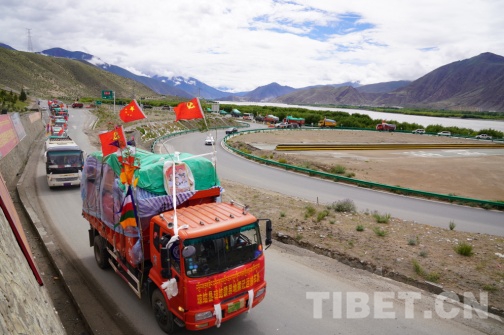 圖為瓊結(jié)鎮(zhèn)搬遷運(yùn)輸車隊(duì)從松贊干布陵區(qū)統(tǒng)一出發(fā)到搬遷點(diǎn)。攝影:曲杰