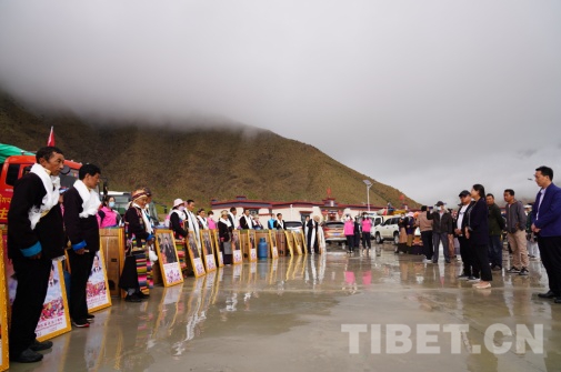 經(jīng)過(guò)一個(gè)多小時(shí)的路程,上午11時(shí)30分,車隊(duì)駛?cè)攵囝H章鄉(xiāng)嘎東團(tuán)結(jié)新村搬遷點(diǎn)喜遷儀式現(xiàn)場(chǎng)。在喜遷儀式現(xiàn)場(chǎng),早早就到來(lái)的瓊結(jié)鎮(zhèn)扶貧干部們,端著甘甜的青稞酒和象征五谷豐登的切瑪盒,向每位搬遷戶群眾獻(xiàn)上潔白的哈達(dá)。搬遷戶們新的生活將從這里開(kāi)始。