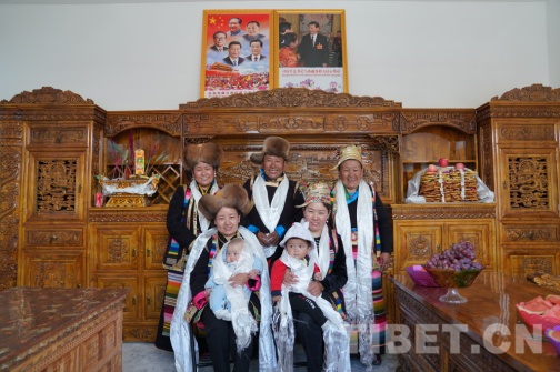 圖為在多頗章鄉(xiāng)嘎東團(tuán)結(jié)新村搬遷點(diǎn),旦增老人一家在新房客廳里留影。攝影:曲杰