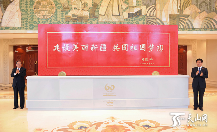 2015年9月25日,時任中共中央政治局常委、全國政協(xié)主席、中央代表團團長俞正聲和時任中共中央政治局委員、自治區(qū)黨委書記張春賢一同為習(xí)近平總書記題詞賀匾揭幕。攝影:新疆日報記者盧民一