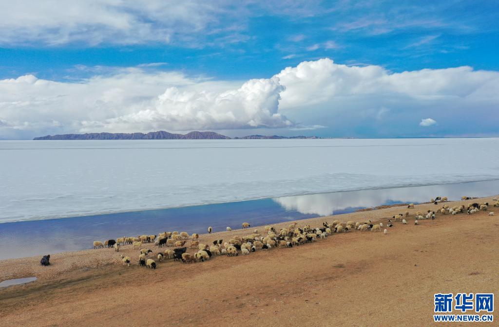 牧民指揮羊群從色林錯(cuò)經(jīng)過(2020年4月29日無(wú)人機(jī)攝)。 新華社記者田金文 攝