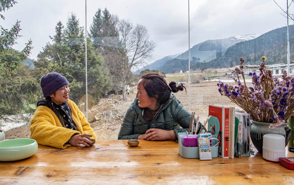 在牛棚改造成的民宿里,唐海玉和央金大姐在聊天(4月2日攝)。新華社記者 孫非 攝