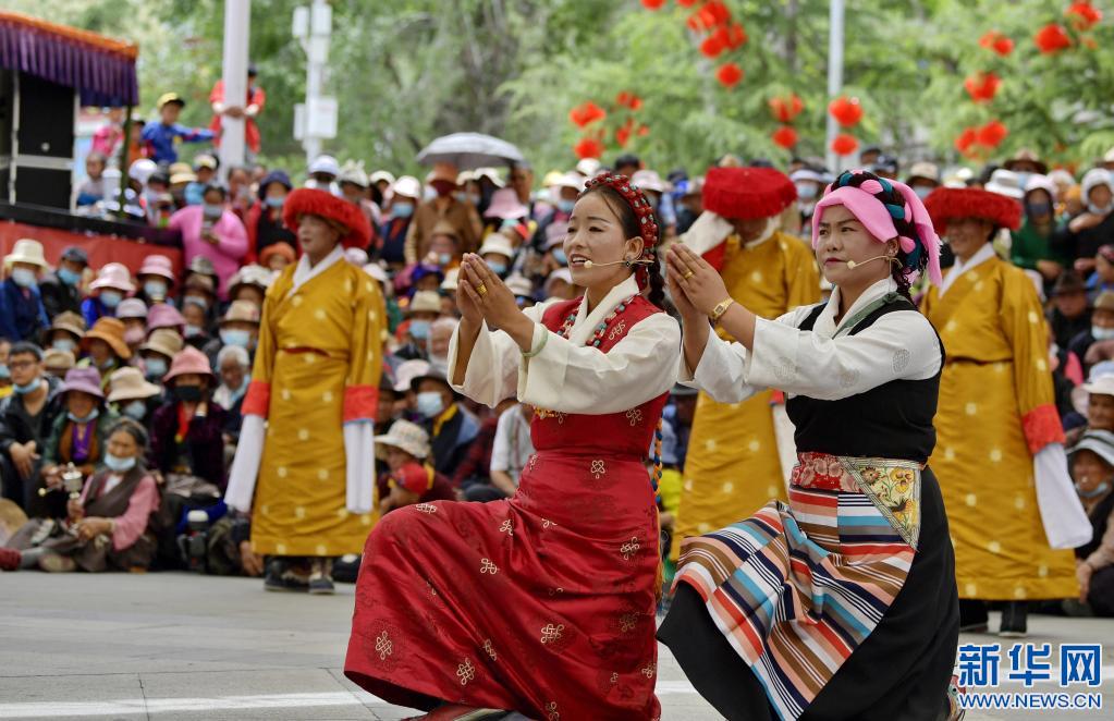 拉薩市堆龍德慶區(qū)馬鄉(xiāng)措麥村民間藏戲隊(duì)正在表演藏戲。(2021年6月12日攝) 新華社記者 張汝鋒 攝