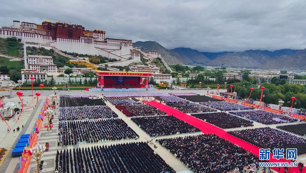 這是8月19日拍攝的慶祝西藏和平解放70周年大會(huì)現(xiàn)場(chǎng)。當(dāng)日,西藏各族各界干部群眾2萬(wàn)多人歡聚在拉薩布達(dá)拉宮廣場(chǎng),熱烈慶祝西藏和平解放70周年。新華社記者 孫瑞博 攝