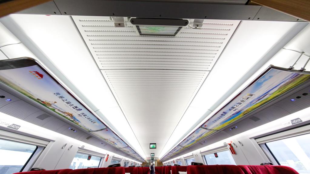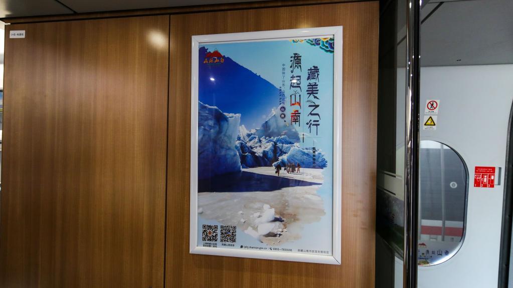 從站臺(tái)開(kāi)始,醒目的車(chē)身外彩貼盡入乘客眼中,由此,山南文化旅游的元素就將伴隨乘客的整段旅程。全列車(chē)廂,雍布拉康、昌珠古寺、桑耶古鎮(zhèn)、羊卓雍措等旅游目的地與“藏美之行 源起山南”“世界之巔在西藏 西藏之源在山南”等旅游口號(hào)互相輝映,將山南歷史文化與盛景濃縮其中,呈現(xiàn)在旅客面前,讓大家近距離感受山南迷人的美景和悠遠(yuǎn)的歷史。
