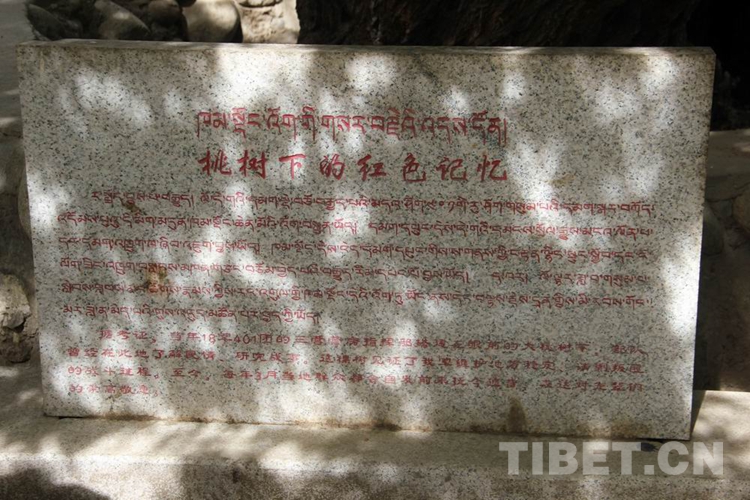石碑用漢藏雙語(yǔ)刻就,題為“桃樹(shù)下的紅色記憶”,正文為“據(jù)考證,當(dāng)年18軍401團(tuán)的三營(yíng)營(yíng)房指揮部搭建在眼前的大桃樹(shù)下,部隊(duì)曾經(jīng)在此地了解民情,研究戰(zhàn)事。這棵樹(shù)見(jiàn)證了我軍維護(hù)地方穩(wěn)定,清剿悍匪的戰(zhàn)斗過(guò)程,至今每年3月當(dāng)?shù)厝罕姸紩?huì)自發(fā)前來(lái)?yè)峤褡肺?,表達(dá)對(duì)先輩們的崇高敬意?!?/p>