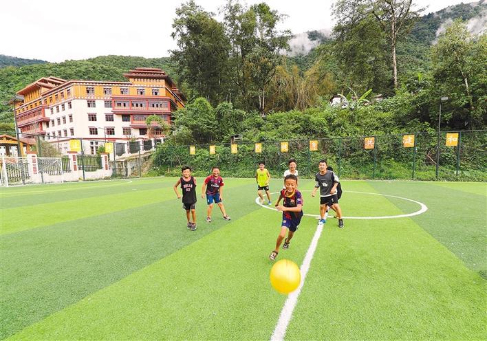 圖為西藏自治區(qū)林芝市墨脫縣墨脫鎮(zhèn)墨脫村的孩子們?cè)诩腋浇淖闱驁?chǎng)上快樂(lè)地踢足球 攝影:西藏日?qǐng)?bào)記者格桑吉美