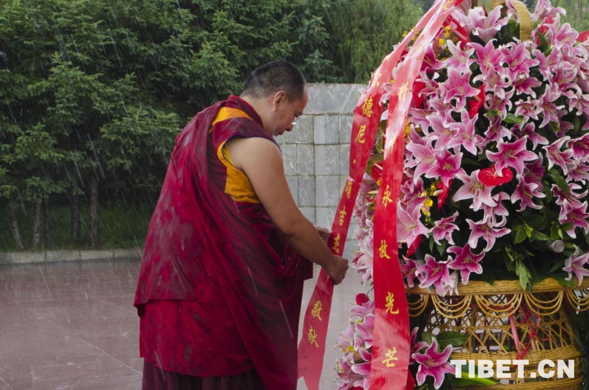 圖為班禪冒雨向革命烈士敬獻(xiàn)花籃 攝影:歐帆