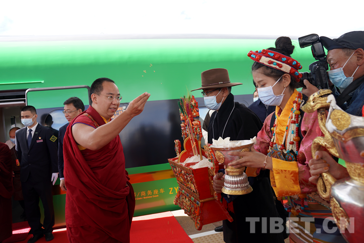 圖為班禪在火車站拋灑青稞、祈愿豐收 攝影:王淑
