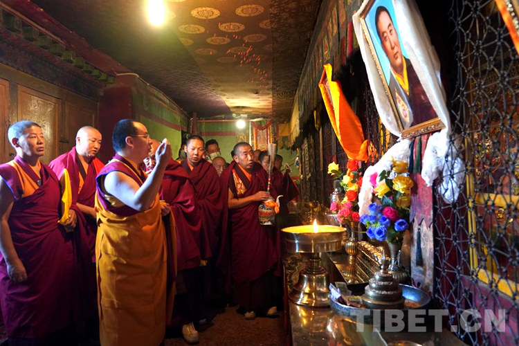 8月9日上午,按照宗教儀軌,在手持香爐和吹嗩吶僧人的引領(lǐng)下,班禪逐一朝拜了釋頌?zāi)辖蒽`塔殿、強巴佛殿等扎什倫布寺主要佛殿,每到一處佛殿,班禪帶領(lǐng)僧眾誦讀經(jīng)文,祈愿世界和平。(中國西藏網(wǎng) 記者/王淑 楊眉笑 拉姆)