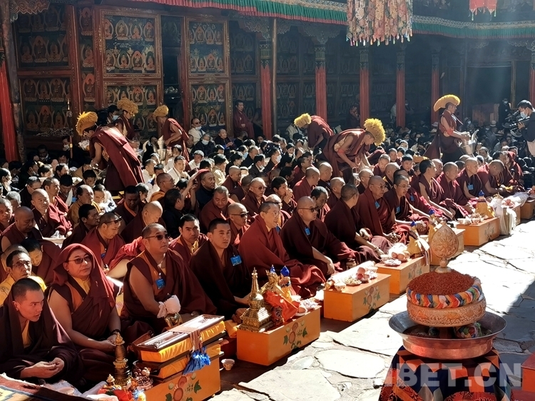 上午10時(shí),隨著法號(hào)響起,領(lǐng)經(jīng)師領(lǐng)經(jīng)下僧眾開始集體誦經(jīng),班禪由手持香爐和吹嗩吶僧人引路來(lái)到扎什倫布寺多加大院。慶祝儀式上,扎什倫布寺高僧活佛、各寺廟僧尼代表及班禪親屬依次敬獻(xiàn)曼扎、禮品。同時(shí),扎什倫布寺僧人在會(huì)場(chǎng)上以辯經(jīng)、跳“卡爾”舞等方式祝賀,并向現(xiàn)場(chǎng)信教群眾發(fā)放酥油茶、人參果、八寶飯等,共沾法喜。場(chǎng)面恢宏,恭敬威儀。