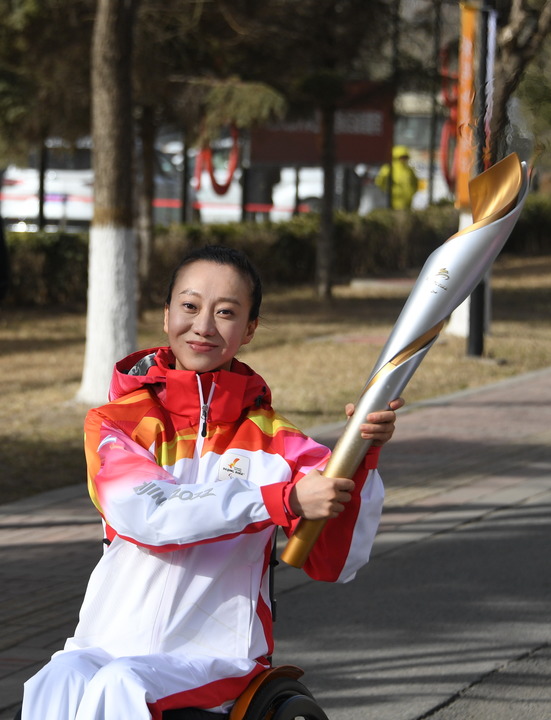 3月4日,火炬手劉巖在北京冬殘奧會(huì)火炬?zhèn)鬟f活動(dòng)中。新華社記者李欣攝