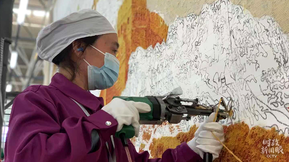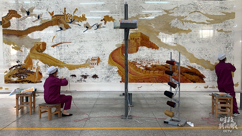 這幅手工槍刺藏毯以長(zhǎng)城為原型,面積接近14平方米。兩人同時(shí)操作需兩個(gè)月時(shí)間完成。(總臺(tái)央視記者王鵬飛、楊松濤拍攝)