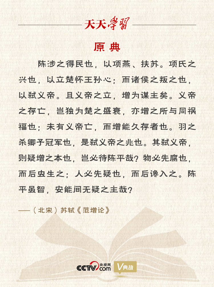 《范增論》是蘇軾早期的一篇史論文章,收錄在《古文觀止》卷十。文中蘇軾針對陳平用計(jì)離間項(xiàng)羽和范增的觀點(diǎn),翻空出奇,立意新穎地提出:“物必先腐也,而后蟲生之;人必先疑也,而后讒入之。”作者打了個比方,東西總是自身先腐爛,然后蟲子才會寄生,說明事物總是自己先有弱點(diǎn)然后才為外物所侵。指出正是由于項(xiàng)羽生性多疑,聽信讒言,才被敵人利用,從而招致慘敗。
