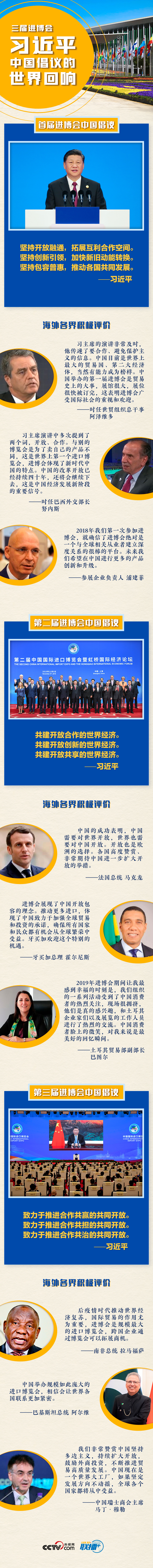 在歷屆進博會上,習近平主席都提出了推動建設(shè)開放型世界經(jīng)濟的中國倡議,宣布了中國擴大對外開放的一系列務(wù)實舉措,贏得國際社會的廣泛認同。