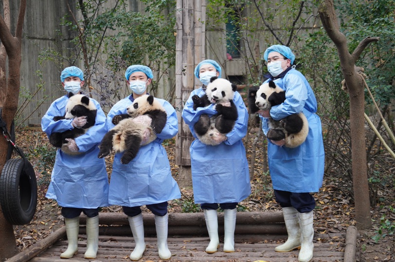 成都大熊貓繁育研究基地2021級熊貓寶寶通過網(wǎng)絡(luò)“云亮相”的方式,慶祝北京冬奧會圓滿舉行。 (成都大熊貓繁育研究基地供圖)