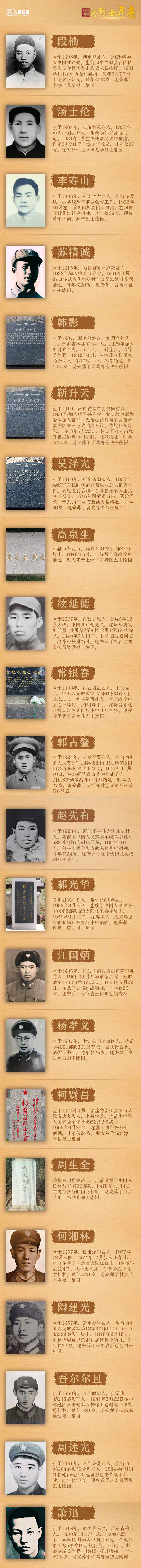 確認(rèn)找到親屬的烈士包括:段楠烈士、湯士倫烈士、李壽山烈士、蘇精誠烈士、韓影烈士、靳升云烈士、吳澤光烈士、高泉生烈士、續(xù)延德烈士、常銀春烈士、郭占鰲烈士、趙先有烈士、郝光華烈士、江國炳烈士、楊孝義烈士、柯賢昌烈士、周生全烈士、何湘林烈士、陶建光烈士、吾爾爾且烈士、周述光烈士、蕭迅烈士。