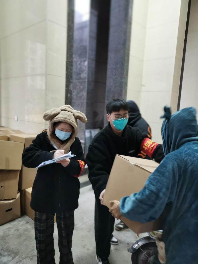 “90后”志愿者胡嬌嬌(左一)在協(xié)助登記進(jìn)入小區(qū)的物資。(受訪者供圖)