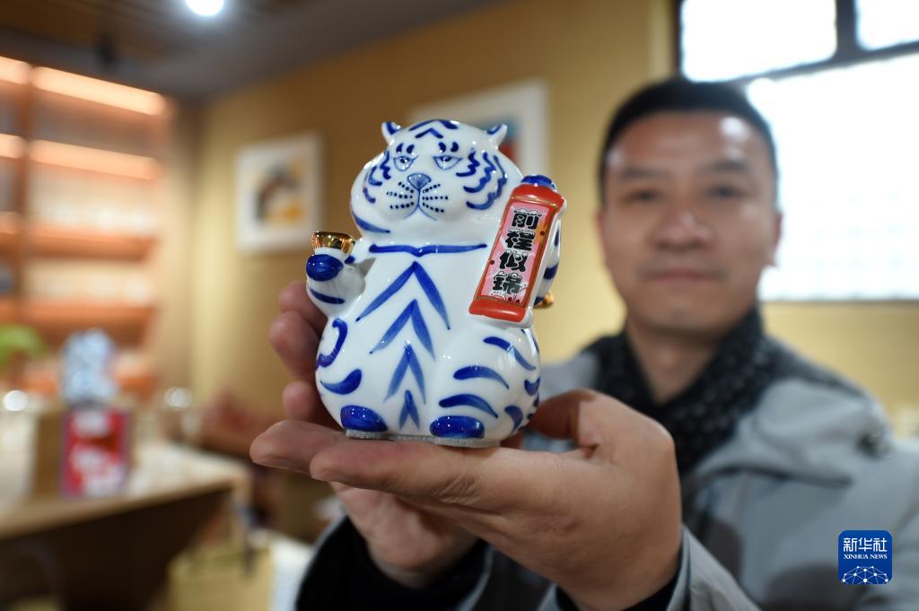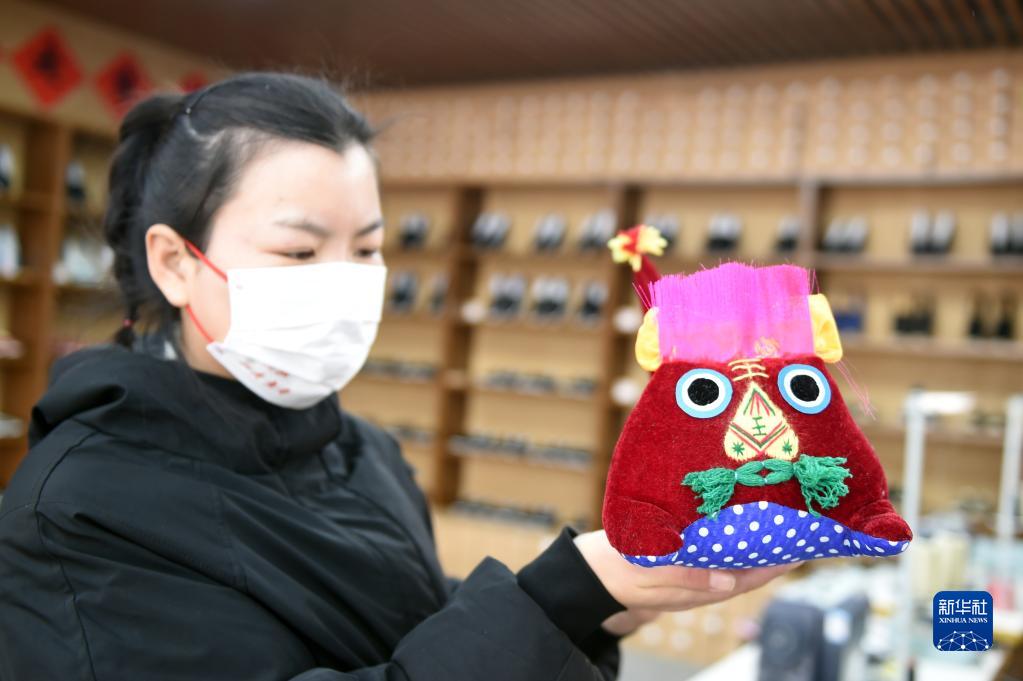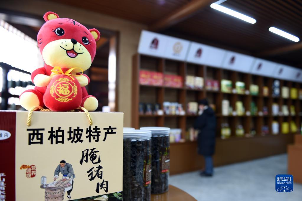 1月28日,在河北省平山縣西柏坡鎮(zhèn)北莊村西柏坡文創(chuàng)館,工作人員展示特色文創(chuàng)產(chǎn)品。新華社記者 駱學峰 攝