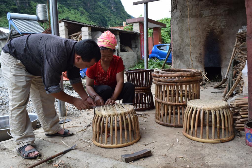 云南耿馬縣勐撒鎮(zhèn)翁達(dá)村黨總支書(shū)記俸紹春指導(dǎo)群眾編制藤蔑鼓凳。(受訪對(duì)象供圖)