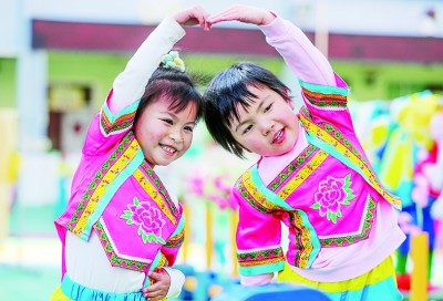 貴州省銅仁市玉屏侗族自治縣實驗幼兒園的小朋友在進行“時裝”走秀。胡攀學(xué)攝/光明圖片
