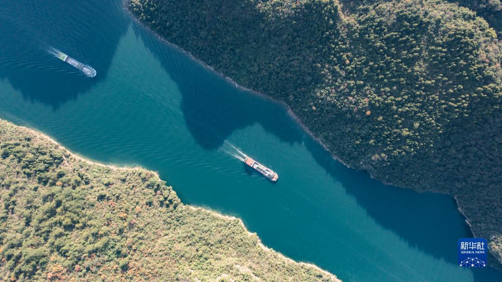 運(yùn)載磷礦石的貨船沿烏江航道順流航行(2021年11月18日攝,無人機(jī)照片)。新華社記者 陶亮 攝