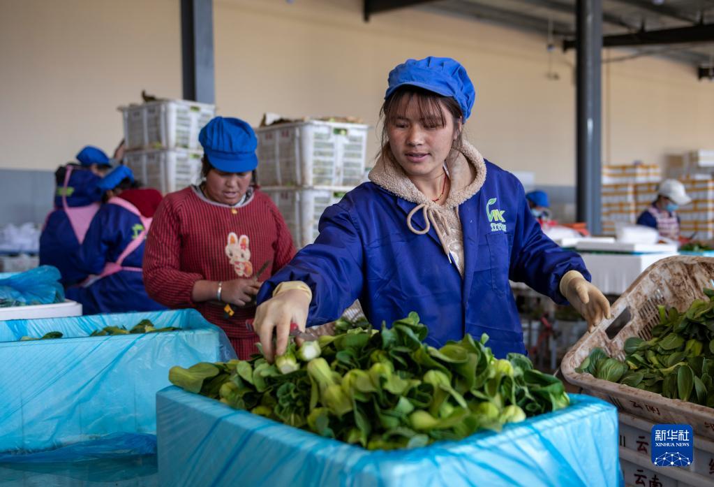 3月3日,脫貧群眾在云南省曲靖市會(huì)澤縣一蔬菜冷鏈企業(yè)分揀蔬菜。新華社記者 陳欣波 攝