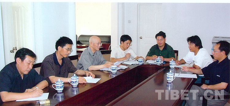 圖為陳慶英先生(左3)主持中國(guó)藏學(xué)研究中心歷史研究所會(huì)議,討論《西藏通史》相關(guān)工作 (圖片由張?jiān)铺峁?/p>
