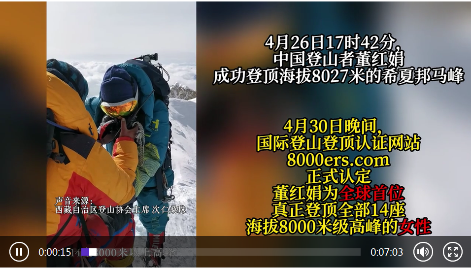 4月26日17時42分,中國登山者董紅娟成功登頂海拔8027米的希夏邦馬峰。30日晚間,國際登山登頂認證網站8000ers.com正式認定董紅娟為全球首位登頂全部14座海拔8000米級高峰的女性。