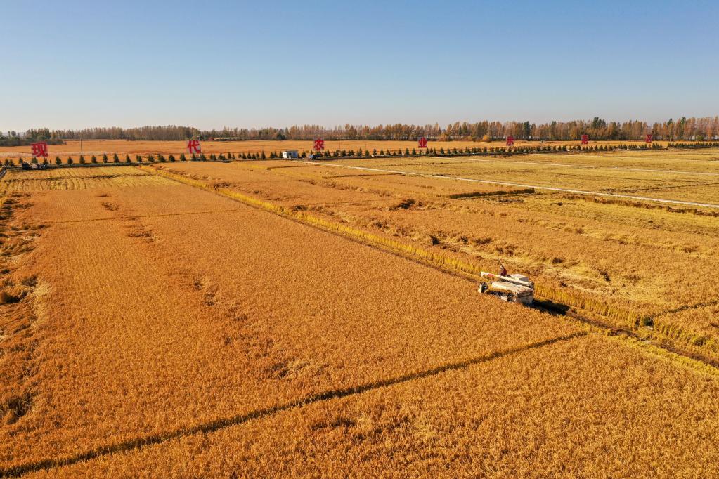 2021年10月12日,在吉林省吉林市永吉縣萬昌鎮(zhèn),農(nóng)民駕駛農(nóng)機收割水稻(無人機照片)。新華社記者 張楠 攝