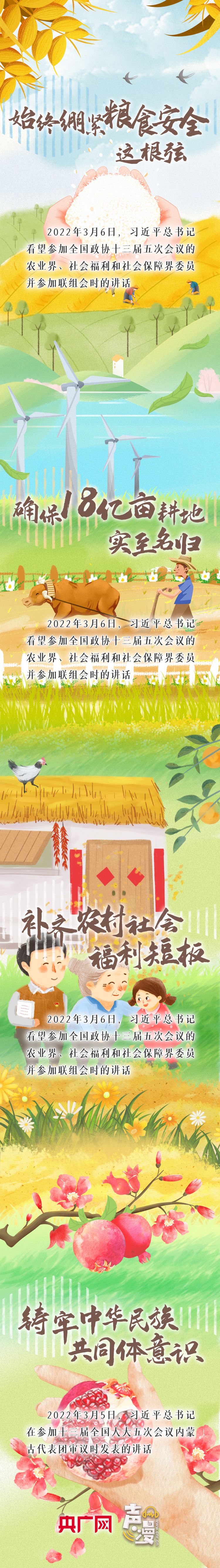 2022年全國兩會期間,習(xí)近平總書記多次“下團組”,同代表委員們深入交流、共商國是,“始終繃緊糧食安全這根弦”“確保18億畝耕地實至名歸”“補齊農(nóng)村社會福利短板”“鑄牢中華民族共同體意識”……習(xí)近平總書記一系列重要講話,凝聚著人民的心聲,飽含著群眾的期盼,讓我們一起聆聽!