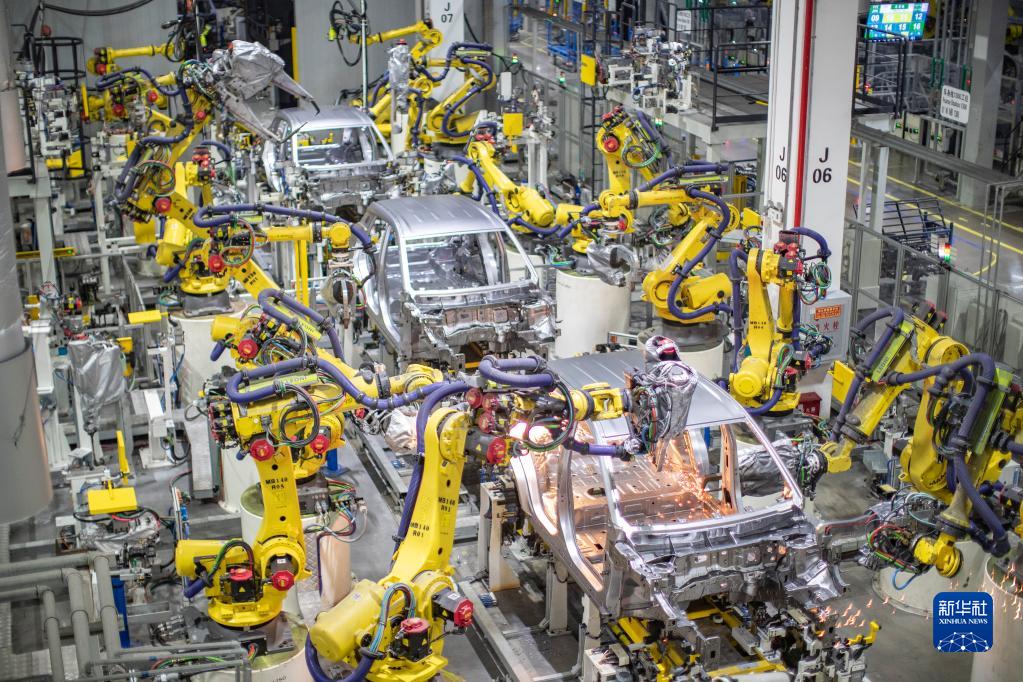 重慶一家新能源汽車企業(yè)使用智能化焊接機(jī)器人進(jìn)行焊接作業(yè)(2021年4月2日攝)。 新華社記者 黃偉 攝