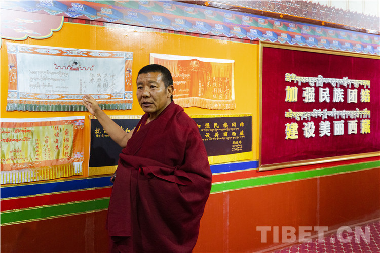 圖為扎什倫布寺管委會副主任賽巴·多布瓊在該寺民族團結(jié)和愛國主義教育基地講解 攝影:趙振宇