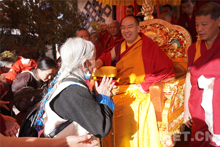 圖為十一世班禪額爾德尼·確吉杰布在扎什倫布寺多加大院為信教群眾摸頂賜福 攝影:王淑