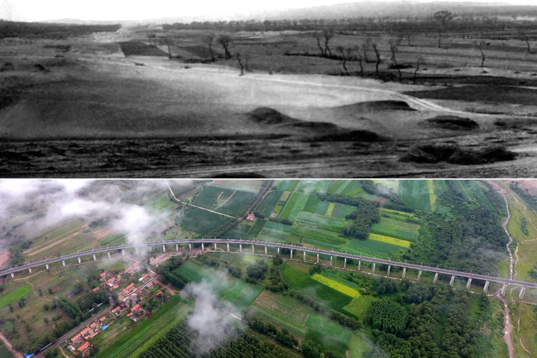拼版照片:上圖為治理前的山西省右玉縣右衛(wèi)鎮(zhèn)的景象(資料照片);下圖為2017年7月22日拍攝的山西省右玉縣右衛(wèi)鎮(zhèn)一帶景象(新華社記者 詹彥 攝)。